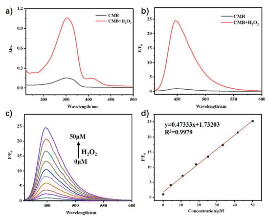 (a) UV-vis absorption and (b) fluorescence emission spectra of CMB before and after addition of H2O2. (c) Fluorescence responses of CMB (2 μM) to various concentrations of H2O2. (d) The linear correlation between the fluorescence intensity at 450 nm and H2O2 concentration.