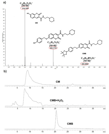 (a) HRMS of CMB after adding H2O2. (b) Liquid chromatography of CMB, CMB treated with H2O2, and CM.