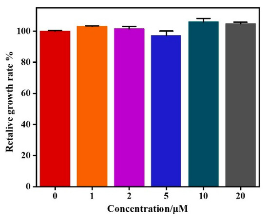 Taking into account the particularity of the biological environment, the viability of cells against the probe was determined using the CCK8 assay technique [37] to evaluate the cytotoxicity of the CMB. The relative growth rate of cells was detected upon exposure to CMB with concentrations of 0 to 20 μM for 24 h. As is shown in Figure 4, the cell survival rate was greater than 90% at probe concentrations up to 20 μM, demonstrating that CMB has an acceptable cytotoxicity to cells within this concentration range and can be used in biological systems. Thus, it can perform the subsequent cell imaging experiment.