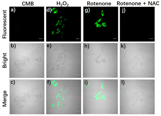 In addition, endogenous hydrogen peroxide is generated by the stimulation of rotenone [38,39], so the imaging ability of CMB to the endogenous H2O2 level of MCF-7 cells could be studied by adding rotenone. When cells were treated with rotenone with the addition of CMB, an obvious fluorescence could be observed (Figure 6). After incubating the rotenone-pretreated cells with N-acetylcysteine (NAC) [40], a common H2O2 inhibitor, the intracellular fluorescence was basically negligible, indicating the H2O2 produced by the stimulation of rotenone was eliminated. These results proved the ability of CMB to detect endogenous H2O2. The cell imaging experiment demonstrated that the CMB has favorable membrane-permeability, showing its potential for fluorescence imaging of exogenous and endogenous H2O2 levels in cells.
