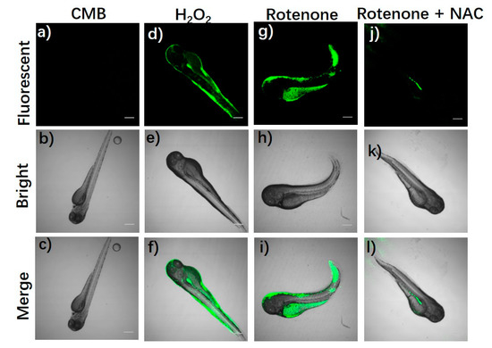 Zebrafish embryos were maintained at 28.5 °C. First, the zebrafish were only incubated with CMB (2 μM) as the control group. Another group of zebrafish was stimulated with rotenone (2 µM), and then treated with CMB (2 µM). Then the last group of zebrafish was stimulated with rotenone (2 µM), incubated with NAC (1 mM) to eliminate the endogenous H2O2, and treated with CMB (2 µM). The zebrafish were washed three times with PBS after incubation and imaged on a confocal laser microscope with a 4× objective lens.