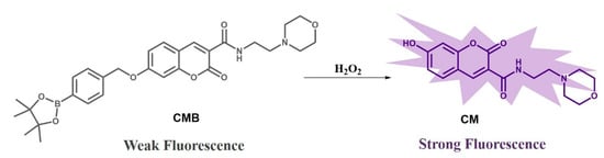 In recent years, various analytical methods that can detect hydrogen peroxide have been reported, such as fluorescence spectroscopy, electroanalysis, chemiluminescence, etc. [15]. The fluorescence detection method is paid much attention among many other analytical methods due to its characteristics of good selectivity, high sensitivity, quick response rate, as well as real-time detection [16,17,18]. It tends to be used for detecting and tracking certain biomolecules in cells or organisms [19] because of its non-invasiveness and ease of operation [20,21,22], and thus has great potential in detecting small molecules’ markers to help in the diagnosis of some diseases. Some fluorescent small-molecule probes for detecting ROS have been reported [23,24,25,26,27]. These studies proved the feasibility of using fluorescent small-molecule probes to detect H2O2 and can promote the development and progress of H2O2 probes, which may facilitate the realization of its applications in medicine.