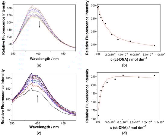 (a,c) Fluorescence spectra (λexc = 320 nm) of 1a (top) and 1e (bottom) (c = 2.0 × 10−6 M) at different concentrations of ct-DNA. (b,d) Dependence of the fluorescence intensity at 390 nm for the solution of 1a (a,b) and 1e (c,d); the black dots are experimental values, whereas the red line is a fitted value according to the Scatchard model [88]. The measurements were performed in Na cacodylate buffer (pH 7.0, 50 mM at 25 °C, containing <1% DMSO).