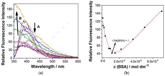 Accordingly, upon the addition of BSA, the fluorescence of 1a was quenched until a ratio of 1:1 between 1a and BSA was reached (Figure 4, arrow A). Further additions of BSA induced a fluorescence increase in 1a and a considerable broadening of the emission spectrum, accompanied by a significant hypsochromic shift of the emission maximum (Figure 4, arrow B). Such opposite changes clearly indicate the formation of two types of complexes. The fluorescence quenching upon the addition of BSA to 1a is assigned to the aggregation of two molecules within the BSA binding site, whereas further additions of BSA allowed each molecule of 1a to bind to an independent binding site, thus resulting in the formation of a 1:1 complex (denoted as 1a@BSA) and a consequent fluorescence increase. Multicomponent nonlinear regression analysis of the fluorescence data using HypSpec2014 software [93] gave the best fit to the formation of 1a@BSA complexes in the stoichiometries 2:1 and 1:1, with the association constants logβ (1a2@BSA) = 11.38 ± 0.04 and logβ (1a@BSA) = 5.24 ± 0.05, respectively.