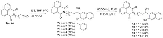 Naphthalimide aldehydes 4 were treated with Grignard reagent 6, and after hydrolysis, coupled products 7 were isolated in moderate yields. We tried several deprotection protocols, such as the usual hydrogenolysis, over Pd/C [30] or treatment with triethylsilane and Pd/C [68], or cyclohexene and Pd/C [69], which were unsuccessful due to a competing elimination of the benzylic alcohol. However, we encountered a hydrogen transfer procedure with ammonium formate on Pd/C [70] that gave the desired target molecules 1 in moderate yields (Scheme 4).
