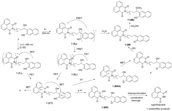 A plausible mechanism for the formation of ethers, as well as for the cleavage photoproducts upon excitation at 350 nm, is shown in Scheme 5. The mechanism involves PET from the naphthol to the naphthalimide as the key step, which was indicated from the LFP measurements, and is in accordance with the mechanism proposed by Freccero et al. [63]. Thus, the formation of the QM and methanolysis product upon excitation at 254 nm may proceed via the dehydration mechanism proposed by Popik et al. [36]. However, due to efficient FRET from the naphthol to the naphthalimide, the methanolysis upon excitation at 254 nm is not efficient. On the other hand, excitation at 350 nm leads to naphthalimide S1, which, after an efficient ISC, leads to a naphthalimide triplet excited state. The naphthalimide triplet may undergo PET, whereupon the naphthol radical cation and the naphthalimide radical anion are formed (1(CT) in Scheme 5). Efficient back electron transfer (BET) gives 1 in the ground state, and it is probably the main deactivation pathway resulting in the low efficiency of the photochemical processes. In a protic solvent, the acidic radical cation is deprotonated to the phenoxyl radical 1(BRA), whereas the naphthalimide radical anion is protonated to a ketyl radical 1(BR). The formation of radicals most probably leads to combinations of disproportionation and cleavage reactions, whereupon naphthalimide is formed as a detectable product. Note that the formation of biradicals such as 1(BR) may occur via photoinduced H-transfer reactions. Although such processes are not ubiquitous in the naphthalimide photochemistry [77], photochemical hydrogen abstractions are well documented for imide derivatives such as phthalimides [85]. Furthermore, as suggested by Freccero [63], the naphthalimide radical anion may be protonated before the BET, whereupon naphtholate 1 is formed. A subsequent loss of OH− leads to the formation of QM. Note that the QM formation, in this case, was initiated by excitation of the lower-energy chromophore naphthalimide, at 350 nm. Furthermore, the formation of QMs takes place more efficiently upon excitation at 350 nm, although excitation of the naphthol at 254 nm is followed by FRET to the naphthalimide. However, the FRET is not 100% efficient.