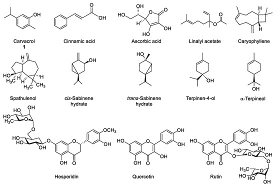 Up to date, many bioactive marjoram constituents have been described, such as: carvacrol, cinnamic acid, ascorbic acid, linalyl acetate, caryophyllene, spathulenol, cis- and trans-sabinene hydrate, terpinen-4-ol, α-terpineol, hesperidin, quercetin, rutin, etc. (Figure 1). Depending on the origin of each plant, its chemical composition may vary according to the three main chemotypes that have been described until now. Thus, the type that is found in Reunion Island, Greek and Egypt contains mainly terpinen-4-ol and sabinenes [5,11,12], while Turkish marjoram contains mainly carvacrol [13,14] and the Iranian type presents a large content of linalyl acetate [15].