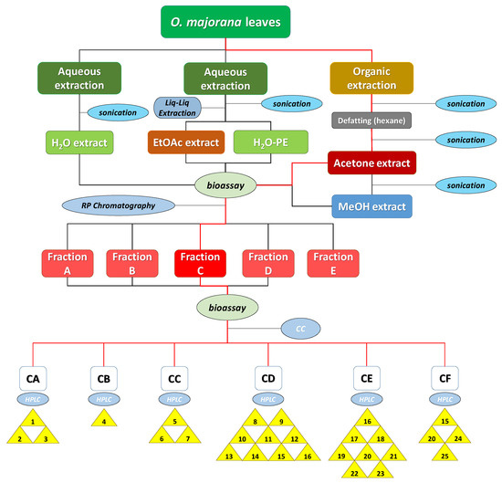 Diagram procedure of the bioguided isolation of O. majorana leaves. The red lines indicate the itinerary for the isolation of compounds 1–25.