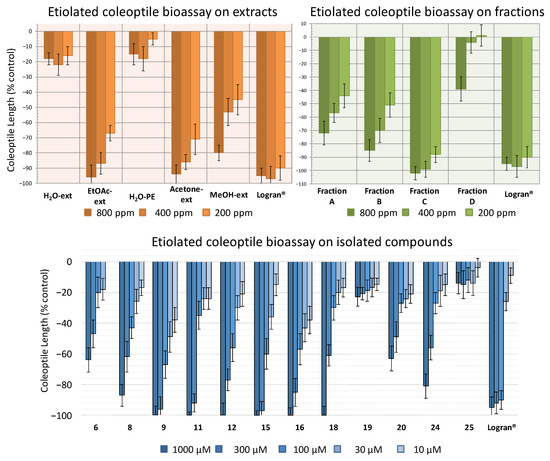 The bioactivity of the extracts H2O-ext, H2O-PE, EtOAc-ext, acetone-ext and MeOH-ext, the fractions A–D, and the compounds 6, 8, 9, 11, 12, 15, 16, 18–20, 24 and 25 was determined by bioassay on etiolated wheat coleoptiles. The bioassays were conducted according to the conditions reported in the literature [55], which have been replicated in this study, where the same herbicide (Logran®) was used as the positive control and the buffer solution as the negative control. The wheat seeds (Triticum aestivum) of the ‘catervo’ variety were kindly provided, free of charge, by ‘Semillas Fitó’ (Spain). All the samples were solved in 0.5% dimethyl sulfoxide and produced clear solutions at all the concentrations tested (800–200 ppm or 1000–10 μM). The results are shown in Figure 4.