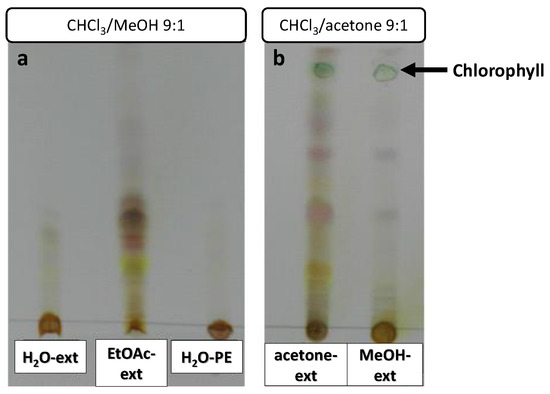 Extract samples were subjected to TLC to confirm the presence of organic compounds (Figure 5). Chlorophyll could be observed as a green spot in the acetone-ext and MeOH-ext TLC (Figure 5b). A number of highly polar compounds were observed in all the extracts, though mid-polarity compounds were only observed in EtOAc-ext and acetone-ext.