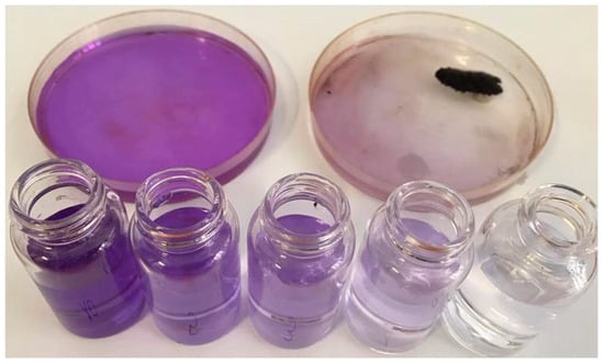The magnetic nanomaterial is now ready for the adsorption experiment and 4–5 mL of crystal violet (CV) aqueous solution in a concentration of 10 mg L−1 can be added to the dish. The solution is dark violet when added. The dish is gently shaken with a rotary movement in order to favor the contact between the magnetic material and the dye. Afterwards, the magnet can be placed again next to the dish bottom (always outside the container): it attracts the magnetic solid and allows for observing the lighter color of the solution after CV removal (Figure 2).
