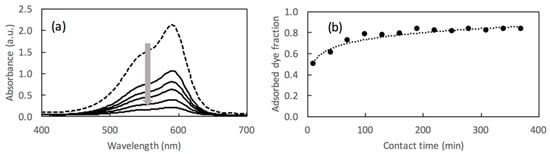 UV-vis spectra of CV solution before (broken-line curve) and after (solid-line curves) a prolonged contact with BBS-functionalized magnetic material for 6 h (a), and relative adsorbed dye fraction trend as determined by reading 592 nm absorbance (b). The grey arrow in section (a) indicates the trend of the absorption in time.
