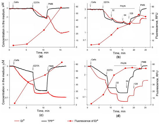 Depending on the concentration, polycationic antibiotic PMB permeabilizes the OM and depolarizes the plasma membrane (PM) [16]. Results of the potentiometric measurements demonstrated that effects of PMB on Et+ accumulation in S. typhimurium cells of both strains were dependent on the presence of PAβN: PMB was able to induce an additional accumulation of Et+ in the absence of PAβN (see Figure 1a,c), but the leakage of this indicator from cells was observed in the presence of the efflux inhibitor (see Figure 1b,d). In the absence of PAβN, the addition of PMB considerably increased the fluorescence of Et+ (see Figure 1a,c).