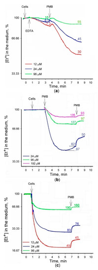 We decided to explore in more detail the dependence of the interaction of Et+ with S. typhimurium cells on the concentration of this indicator. Taking higher initial Et+ concentrations in the medium, we added intact or heat-killed cells and determined amounts of Et+ accumulated by the cells (see Figure 2). Additions of EDTA to Tris medium induced accumulation of Et+ by the cells, but the permeabilizing effect of this chelator was considerably weaker compared to the 3 μM indicator containing medium (see Figure 1a,b). PMB induced a considerably stronger accumulation, but the amount of Et+ bound was not high compared to the cells, preliminary treated with Tris/EDTA (see Figure 2b). In the absence of EDTA, PMB was more efficient, and the equilibrium distribution of Et+ across the cell envelope was achieved in two minutes after PMB addition (see Figure 2b). At lower concentrations, i.e., 24 μM, the PMB-induced accumulation of Et+ was not stable, and a release of this indicator followed the accumulation (see Figure 2b). Et+ was only released to the medium after the second PMB addition. The results of these experiments indicate that in high concentrations, there is no direct correlation between the cell-bound amount of Et+ and the initial concentration of the indicator in the medium.