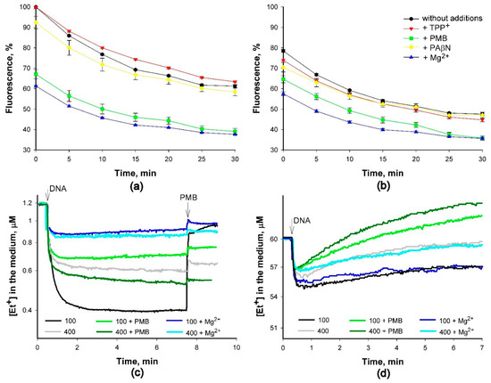 We start to register the increase in fluorescence of Et+ simultaneously with the potentiometrically observed influx of this indicator into the cells. It is also indicated that primary binding occurs up to a bound-Et+-to-DNA-nucleotide ratio of 0.20–0.25, and if the Et+/DNA ratio is below 0.14, there are no changes in the spectrum [25]. However, we have not detected any threshold for an increase in Et+ fluorescence after this indicator binding to DNA. It is possible that the increase in Et+ fluorescence starts before it intercalates into DNA. Et+ binding to DNA is the ionic strength, as well as medium composition-dependent, and the presence of Mg2+ in the medium decreases the binding of Et+ to DNA and the fluorescence of this compound (see Figure 5). The decrease in Et+ fluorescence during the incubation with DNA was observed also in the absence of PMB or Mg2+ (see Figure 5 a,b). This could be because DNA–ethidium complexes become more accessible to water, which is a highly efficient fluorescence quencher [26], and the removal of water increases the fluorescence.