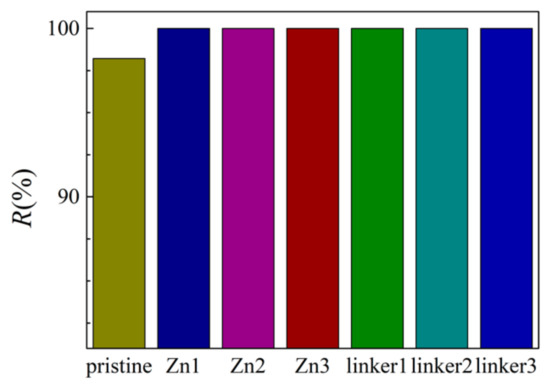 Furthermore, the heights of the first peaks of the O–O curves (Figure 11b) decrease in the following order: Zn3 > linker2 > Zn1 > Zn2 > linker1 > pristine > linker3, which indicate that the hydrophilicity of a ZIF-8 membrane can be potentially improved by introducing a sufficient amount of linker defects to it. However, such an enhanced hydrophilicity will reduce the water flux through the membrane, as evident from the relatively low water flux through the linker substitutional defective ZIF-8 membranes compared with that of the pristine ZIF-8 membrane. According to the heights of the first peaks of the RDFs pertaining to the interactions between the salt ions and water molecules and the atoms at the defect sites, the H3 atoms at the Zn defect sites (Zn1, Zn2, and Zn3) generally exhibit a higher affinity towards Cl− ions than water molecules. Meanwhile, the H3, H4, and O2 atoms at the linker1, linker2, and linker3 defect sites generally display a stronger affinity toward water molecules than the salt ions.