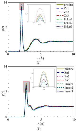 RDFs of the O atoms from the water molecules around the ions: (a) Na+ ions and (b) Cl− ions for the respective ZIF-8 membranes.