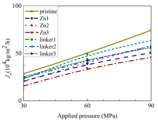 As shown in Figure 8, the pristine ZIF-8 membrane corresponds to the highest water flux, followed by the linker substitutional defective membranes (linker3, linker1, and linker2) and the Zn substitutional defective membranes (Zn1, Zn2, and Zn3). As evident from the relationship between the pore diameter and the water flux, large cavities and apertures increase the water flux, as evident in the cases of the pristine ZIF-8 membrane that possesses the largest cavity diameter and exhibit the highest water flux and the linker3 membrane that possesses the largest aperture diameter and exhibit the second-highest water flux. With respect to the type of defects, the ZIF-8 membranes with linker defects generally exhibit the second-highest water flux due to them possessing larger cavities than the Zn defects and the largest aperture diameters collectively. However, even if the cavities or the apertures are large, the water flux will still be low if the other kind of pores are too small. This is evident in the case of the Zn3 membrane (3.52 Å), which despite having a larger aperture diameter than pristine ZIF-8 membrane (3.40 Å), possesses the second smallest cavity diameter (11.0 Å) among the studied ZIF-8 membranes. Based on Figure 9, the pristine ZIF-8 membrane displays the highest water flux among all the membranes at higher pressure values. Furthermore, under an applied pressure of 60 MPa, the ZIF-8 membranes with linker substitutional defects (linker1, linker2, and linker3) generally exhibit the second-highest water flux after the pristine ZIF-8 membrane.