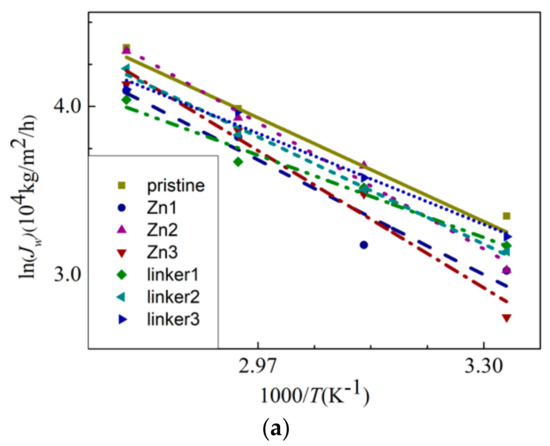 where Ea, R, and T are the apparent activation energy, gas constant, and temperature, respectively. The water flux JW against the reciprocal of T is plotted in Figure 10a, and the linear fitting of the curves provides the apparent activation energy values for water permeation through the membranes. From the gradients of the Arrhenius plots for the respective ZIF-8 membranes, the activation energy value for water permeation decreases in the following order: Zn3 (20.5 kJ/mol) > Zn2 (18.9 kJ/mol) > Zn1 (17.2 kJ/mol) > linker2 (16.0 kJ/mol) > pristine (15.5 kJ/mol) > linker3 (13.6 kJ/mol) > linker1 (12.3 kJ/mol). Positive values of the activation energy indicate that water flux can be improved with a higher feed temperature [23]. Based on the values of Ea, the presence of Zn substitutional defects in a ZIF-8 membrane can generally increase the value of Ea, while it is possible for linker substitutional defects to lower the value of Ea, with the latter depending on the concentration of linker substitutional defects in the membrane. Therefore, water flux may not improve significantly for ZIF-8 membranes with Zn substitutional defects even by increasing the feed temperature. According to the value of Ea of the pristine ZIF-8 membrane, its corresponding activation energy is lower than that recorded in the study of Hu et al. (24.4 kJ/mol) [5], in which used a fully rigid ZIF-8 membrane that hinders water flow was utilized, as mentioned above.