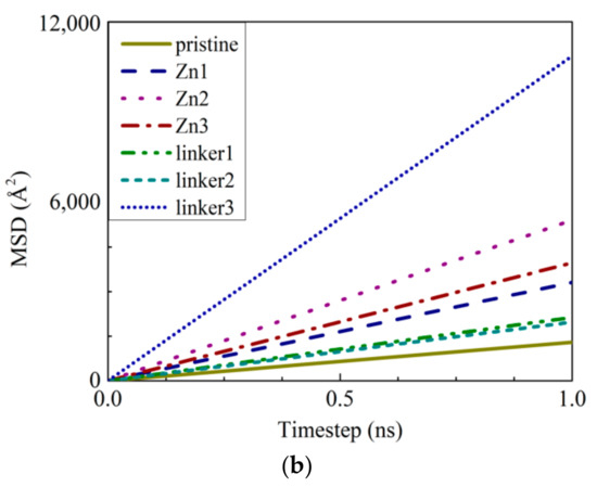 To study the diffusion of water through the membranes, the mean square displacements (MSDs) of the water molecules were evaluated (Figure 10b). The measured displacements of the water molecules were measured with respect to their equilibrium positions. The linear fitting of an MSD curve provides the diffusion coefficient D according to the relation , where t is the simulation time. This approximation method is commonly used in MD simulations to obtain the membrane diffusion coefficients [23]. Based on our results, the value of D decreases in the following order: linker3 > Zn2 > Zn3 > Zn1 > linker1 > linker2 > pristine, which indicates that water molecules moved more quickly in substitutional defective ZIF-8 membranes than pristine ZIF-8 membranes. However, such an observation appears to contradict the water flux records, which show that the presence of substitutional defects reduces the water flux through a ZIF-8 membrane. Therefore, the obtained diffusion coefficient values suggest that the rate of diffusion does not depend on the size of the cavities or apertures. Instead, it depends on the interactions between the water molecules and the constituent atoms of the ZIF-8 membranes, as described in the subsequent paragraphs.