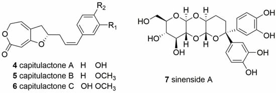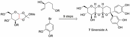- Paresh, M.V.; Chepuri, V.R. Total synthesis of sinenside A. Org. Lett. 2015, 17, 1717–1724. [Google Scholar]