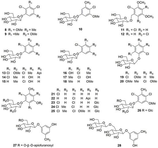 Curculigines are rare natural chlorine-containing compounds occurring in C. orchioides. Xu and his co-workers reported three chlorophenolic glucosides, B and C from the rhizome of C. orchioides in 1987 and 1992 [41,42]; Cao et al. (2009) identified curculigine D [43]. From rhizomes of C. orchioides, Wang et al. (2013; 2014; 2018) obtained eleven chlorophenolic glucosides as curculigine E–O (8–18). Among them, compounds 8–10, 12, 14–18 showed moderate effects on osteoblast proliferation with a proliferation rate of 10.1%–15.9% in MC3T3-E1 cells. Further structure–activity relationship analysis revealed that anti-osteoporosis activity of chlorophenol glycosides is higher than that of phenolic glycosides. The C-6-linked chlorine in chlorophenol glycosides may reduce their anti-osteoporosis activity and the introduction of a C-5 hydroxyl group into the aglycone of chlorophenol glycosides increases their anti-osteoporosis activity [44,45,46]. Deng et al. (2020) isolated two new chlorophenolic glucosides named curculigine P and Q (19, 20) from the rhizomes of C. orchioides, and compound 19 displayed high inhibitory potential against 5-reductase in a HaCaT-based bioassay [47]. Chen et al. (2017) purified five chlorophenolic glucosides (21–25) from C. orchioides, and all the compounds showed no xanthine oxidase inhibitory activities [48]. In addition, curculigine A (26) was isolated from the same plant and showed no toxicity to human HL-7702 hepatocytes [49]. Chao Niu et al. isolated Orcinol-1-O-β-d-apiofuranosyl-(1→6)-β-d-glucopyranoside (27) and Anacardoside (28) by CC (ODS, MeOH-H2O, 1:5, MeOH-H2O, 1:1) [35] (Figure 3).