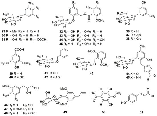 Phenolic compounds are the main metabolites occurring in the plants of the genus Curculigo. From the rhizomes of C. orchioides, Wang et al. (2013; 2014) obtained two new phenolic glucosides, orcinoside H (29) and curculigoside I (42), together with ten known ones as orcinol glucoside (30), orcinol glucoside B (31), curculigoside A (32), curculigoside B (33), curculigoside C (34), curculigoside G (35), 3-hydroxy-5-methylphenol-1-O-[β-glucopyranosyl-(1-6)-β-d-glucopyranoside] (36), 3-hydrox-5-methyl-phenol-1-O-[β-apiosyl-(1-6)-β-glucopyranoside] (37), glucosyringic acid (39), and benzyl-O-β-d-glucopyranoside (40). Among them, compounds 30, 31, 34, 39, and 42 showed weak anti-osteoporotic activity [44,45]. Jiao et al. (2013) isolated orcinol glucoside (30), curculigoside B (33) and glucosyringic acid (39) from rhizomes of C. orchioides, and all of these three have no hepatotoxicity against the human hepatic cell line HL-7702 [49]. Chen et al. (2017) reported two new heterocyclic phenolic derivatives, orcinosides I and J (44 and 45), together with four known phenolic compounds as 3-(4-hydroxy-3-methoxy-phenyl) propane-1,2-diol (46), 3-(4-Hydroxy-3,5-dimeth- oxyphenyl) propane-1,2-diol (47), piperoside (48), 4-ally-2, and 6-dimeoxy phenol glucoside (49). Among them, orcinosides I (44) and J (45) exhibited xanthine oxidase inhibitory activities with the inhibitor rates of 72.40 ± 4.47% and 36.71 ± 3.67% at the concentrations of 0.55 mM. The IC50 of 44 and 45 were 0.25 and 0.62 mM, respectively (Figure 4) [48]. The other two phenolic compounds, named p-Hydroxycinnamic acid (51) and 3,5-Dihydroxy-4-methoxybenzoic acid (50) were also isolated from dried and powdered rhizomes of curculigo by Chao Niu et al. In addition, the phenolic compounds were also isolated from dried and powdered curcuma rhizomes by Chao Niu et al. [35]. Compounds 50 and 51 were obtained from the genus Curculigo for the first time.