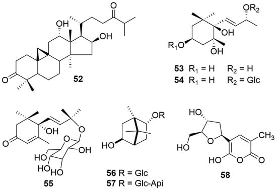 Terpenoids are a small class of second metabolites found in Curculigo species. From the rhizomes of C. orchioides, a new cycloartane-type triterpenoid ketone (52) was isolated [49], and 52 showed hepatotoxicity against the human hepatic cell line HL-7702 in vitro. Zhang et al. (2019) obtained six terpenoids from C. orchioides as (3S,5R,6S,7E,9R)-megatigma-7-ene-3,5,6,9-tetrol (53), actinidioionoside (54), (6S,9R)-roseoside (55), (−)-angelicoidenol-2-O-β-d-glucopyranoside (56), (−)-angelicoidenol-2-O-β-apiofuranosyl-(1→6)-β-d-gluco-pyranoside (57), tetillapyrone [(7R,9S,10R)-3-methyl-5-(4-hydroxyl-5- hydroxylmethyl-tetrahydrofuryl)]-6-hydroxypyran-2-one (58) (Figure 5) [25].