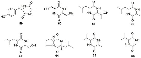 Besides the above compounds, Chen et al. (2017) yielded eight known cyclodipeotides as cyclo-(l-Ala-l-Tyr) (59), cyclo-(l-Ser-l-Phe) (60), cyclo-(LeuAla) (61), cyclo-(Leu-Thr) (62), cyclo-(Leu-Ser) (63), cyclo-(S-Pro-R-Leu) (64), cyclo-(Val-Ala) (65) and cyclo-(Gly-d-Val) (66) were obtained from the rhizomes of C. orchioides (Figure 6) [48].