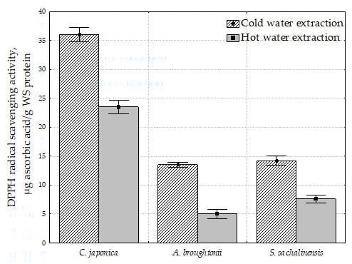 The maximum difference between the cold water and hot water extracts for radical scavenging activity was observed in A. broughtonii (2.7 times for DPPH and 1.9 times for ABTS). The minimum difference between the hot water and cold water extracts for radical scavenging activity was observed in C. japonica (1.5 times for DPPH and 1.4 times for ABTS).