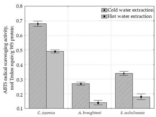 As it can be seen, the highest ABTS radical scavenging activity was determined in the C. japonica cold and hot water extract (0.68 and 0.49 µmol Trolox equiv/g, respectively). Hot water extracts of C. japonica, A. broughtonii and S. sachalinensis were characterized by the decreased ABTS radical scavenging activity compared to the cold extracts.
