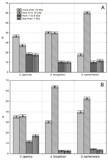 A significant decrease in low molecular weight proteins during hot water extraction was detected. The proportion of protein and peptide components of Group III and IV were lower in hot water extracts by 20.7% for C. japonica, by 64.4% for S. sachalinensis and by 71.8% for A. broughtonii. The total area percentage of low molecular weight peptides (with a molecular weight of less than 5 kDa) was the largest for C. japonica and amounted to 36.3 and 28.8% for cold and hot extracts, respectively. It should be noted that peptides with molecular weight from 1 to 5 kDa were present only in water extracts of C. japonica. Peptides with molecular weight from 2 to 4 kDa were found in water extracts of A. broughtonii and S. sachalinensis.