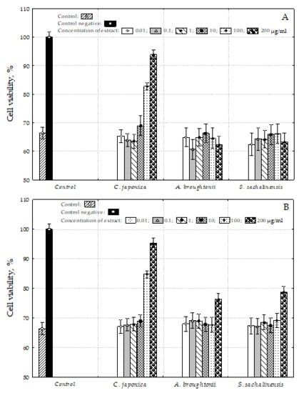 As shown in Figure 4, C. japonica cold and hot water extract treatment over 100 μg/mL concentration significantly increased the cell viability in t-BHP-treated HepG2 cells in a dose-dependent manner (p < 0.05). The cell viabilities were shown to be comparable to the control level in treatment with a 200 μg/mL concentration. A. broughtonii and S. sachalinensis cold water extract treatments at 200 μg/mL concentration showed a weak effect and the cell viabilities were 76.4 and 78.8%, respectively.