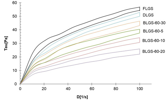 | BLGS-60-10 | 60 | 10 | 33.21 ± 1.77 c | 22.87 ± 0.32 c | 28.69 ± 1.52 a,b | 84.77 ± 3.45 b,c |