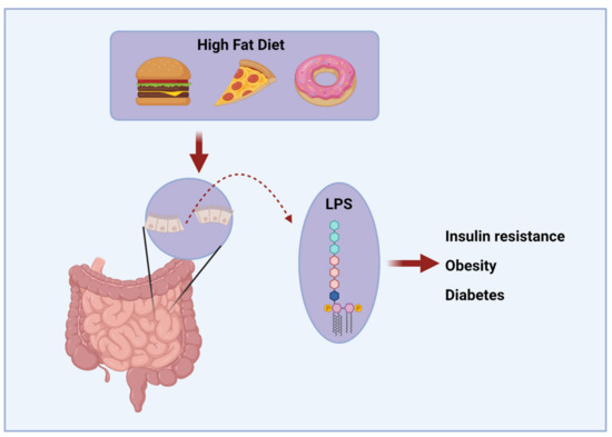 HFD diet can induce inflammation. Chronic HFD consumption can lead to leakage in the intestinal barrier, leading to elevated serum levels of LPS. Elevated LPS may be a triggering factor for the development of insulin resistance, obesity, and diabetes.