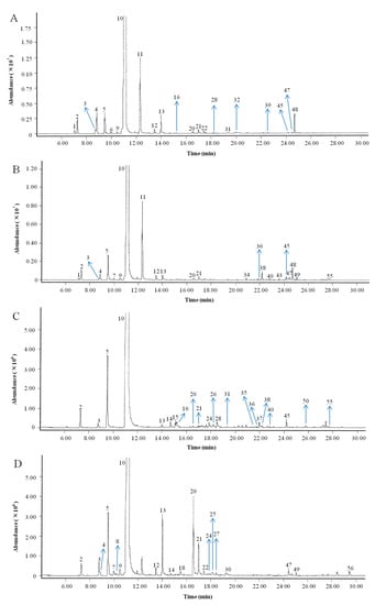 Total ion chromatograms of the four citrus EOs. (A) Nanfeng mandarin EO (NMEO). (B) Xunwu mandarin EO (XMEO). (C) Yangshuo kumquat EO (YKEO). (D) Physiological drop of Gannan Newhall navel orange EO (PDEO).