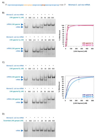 Having designed and synthesised LNA gapmers to target the translation initiation region of E. coli rne mRNA, the next step was to determine if they could bind to E. coli rne mRNA in vitro. We decided to use an EMSA to evaluate LNA gapmer binding. We designed an unstructured 45-mer minimal E. coli rne mRNA corresponding to the −30 to +15 translation initiation region of E. coli rne mRNA to use as the target RNA. This region of E. coli rne mRNA has been reported to be unstructured in the context of the complete rne 5′ UTR [19] and we therefore reasoned that the unstructured minimal E. coli rne mRNA would be a suitable RNA target for preliminary experiments. The minimal E. coli rne mRNA was synthesised as a 3′ FAM-labelled oligonucleotide (Figure 2A) and incubated with an increasing concentration of each of the LNA gapmers. The reaction mixtures were analysed by native-PAGE (Figure 2B–D).