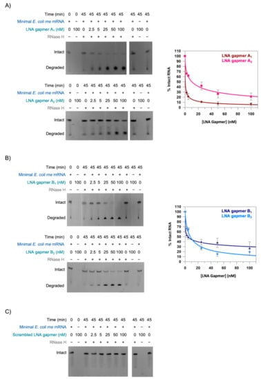 As can be seen from the gels in Figure 4, the amount of intact minimal E. coli rne mRNA remaining at the end of the assay decreased with increasing concentration of LNA gapmer for LNA gapmers A1, A2, B1 and B2 (Figure 4A,B). This suggests that these gapmers all recruit RNase H to the minimal E. coli rne mRNA and facilitate RNase H-mediated cleavage of the mRNA. Efficient mRNA cleavage only occurred in the presence of both LNA gapmer and RNase H (Figure 4A,B). In contrast, no cleavage of the minimal E. coli rne mRNA was observed in the presence of Scrambled LNA gapmer, even at the highest LNA gapmer concentration (100 nM) tested (Figure 4C).