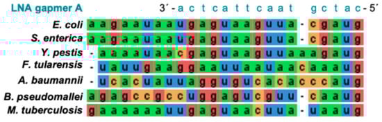 It would also be interesting to investigate whether the antisense oligonucleotides designed here to target E. coli rne mRNA could be effective against rne mRNA from other bacterial species. Small molecule inhibitors of E. coli RNase E also inhibited RNase E from other bacteria suggesting potential as lead compounds in the development of broad spectrum antibiotics [12,13]. As shown in Figure 5, the region where the LNA gapmers A1 and A2 bind to E. coli rne mRNA, is absolutely conserved in the rne mRNA of the closely related bacterium S. enterica. However, in another closely related bacterium, Y. pestis, there is sequence variation. This sequence variation becomes more pronounced in more distantly related bacteria such as Francisella tularensis, Acinetobacter baumannii and Burkolderia pseudomallei. In contrast, the rne translation region in Mycobacteriun tuberculosis is similar to that in E. coli. Experimental validation will be needed to ascertain how much sequence variation can be tolerated before an LNA gapmer fails to have an effect. This will be important for tailoring antibacterial strategies and also for combatting the emergence of antibacterial resistant mutants.