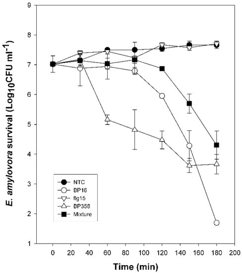 Bactericidal activity was evaluated by comparing the time course to kill mid-logarithmic-phase culture suspensions of E. amylovora. As shown in Figure 1, at the concentration tested, BP358, BP16, and the mixture of BP16 and flg15 showed a bactericidal effect. They reduced E. amylovora population 3–4 log after a 180 min exposure period; BP358 was the peptide that showed faster bactericidal activity.