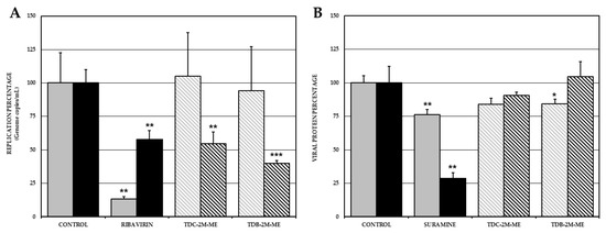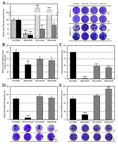 2.3. TDC-2M-ME and TDB-2M-ME Only Inhibit Viral Genome Replication in the Alphavirus Infection Model Whilst TDB-2M-ME Inhibits One Viral Protein Synthesis in the ZIKV Infection Model