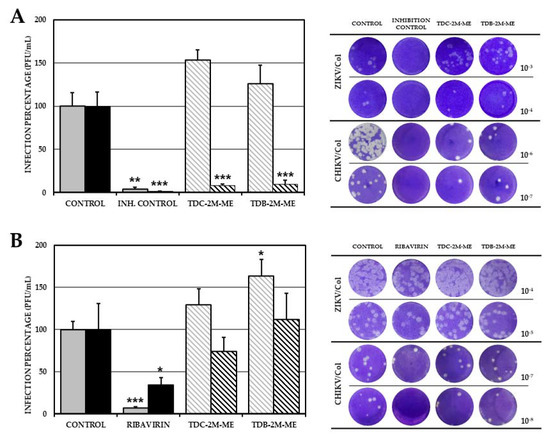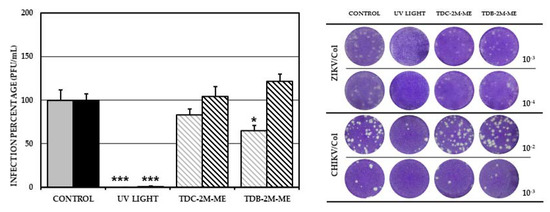 2.4. TDC-2M-ME and TDB-2M-ME Treatment Prior to Infection Inhibits the Alphavirus Model (CHIKV/Col)