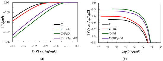 Figure 1a shows the steady-state cathodic polarization curves of the various composite electrodes in methanesulfonic acid (0.1 M CH3SO3H) at a scan rate of 1 mV/s and the corresponding linear polarization curves. The kinetic parameters are as shown in Figure 1b and Table 1. The results show that the C–PdO electrode has a low Eop and the highest exchange current density, with an Io value of 4.2 μA/cm2, and presents the best electrocatalytic properties. The order of the electrocatalytic activity was C–PdO > C–TiO2–PdO > C–TiO2 > C from the exchange current density value. All electrodes exhibit a single-stage Tafel slope (−b) value in the CH3SO3H solution. At the higher Eop values between −300 and −900 mV, the (−b) values of the C, C–TiO2, C–PdO and C–TiO2–PdO electrodes are 120, 169, 79, and 88 mV/dec, respectively. The C–TiO2–PdO electrode has the lowest value. The rds was dominated by the Volmer and Heyrovsky equations [13,35].