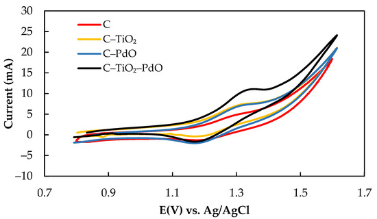 The electrochemical characteristics of the Ce (III)/Ce (IV) active species and CH3 SO3H supporting electrolyte on various composite electrodes were investigated using the CV test. The cyclic voltammograms of various electrodes in 10 mL of 0.01 M Ce(NO3)3·6H2O/0.1 M CH3SO3H solution at a scanning rate of 20 mV/s in the range of 0.7 to 1.7 V are as presented in Figure 2, and the electrochemical characteristics are as summarized in Table 2. The values of Ia and Ic were high, indicating excellent redox efficiency of the composite electrodes in the Ce(NO3)3·6H2O/CH3SO3H solutions. The Ia values were in the following order: C–TiO2–PdO (4.24 mA) > C–PdO (4.22 mA) > C (3.59 mA) > C–TiO2 (3.40 mA) for Ce(NO3)3·6H2O/CH3SO3H solutions. The potential interval values (ΔEp) were in the following order: C–TiO2 (0.18 V) > C–TiO2–PdO (0.15 V) > C (0.14 V) > C–PdO (0.13 V). The high ΔEp value demonstrated that the energy barriers of the redox reactions were higher because of the effects of the Ce(NO3)3·6H2O/CH3SO3H electrolyte solutions on the tested electrodes. The C–PdO electrode presented a better electrocatalytic activity than the C–TiO2–PdO electrode according to the HER kinetic parameter analysis, but the ratio of the anodic–cathodic current (Ia/Ic) was 3.13. By comparison, the C–TiO2–PdO electrode exhibited a higher anodic/cathodic current and a more symmetric Ia/Ic value (1.09), near unity, which indicated a quasi-reversible redox reaction in the Ce(NO3)3·6H2O/CH3SO3H solutions. In addition, the TiO2 particles between a carbon matrix and the Pd metal/Pd oxide layer increased the active surface area of the electrode, improving the electrocatalytic effect of the electrode [13]. Consequently, the C–TiO2–PdO electrode performed most favorably among all the electrode types in the redox kinetic reactions.
