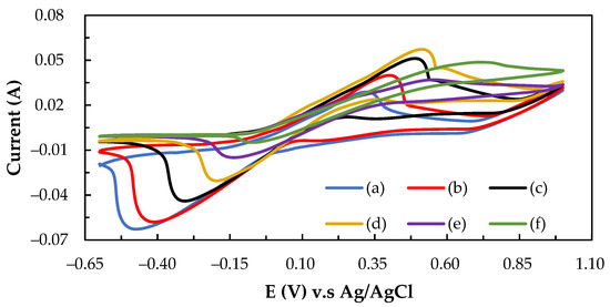 The electrocatalytic activity of the composite electrode was evaluated using the hydrogen evolution reaction (HER). In addition, the exchange current density (Io), Tafel slope value (−b), overpotential (Eop) were calculated [16]. The cyclic voltammetry (CV) experiments were conducted in a three-electrode cell with a CHI 6273 C electrochemical instrument (CH Instruments, Inc., Austin, TX, USA). The cathodic polarization curves were acquired at a constant negative potential and scan rate (1 mV/s) to measure a steady current value in 0.1 M CH3SO3H supporting electrolytes. The composition of the three-electrode cell was as follows: an Ag/AgCl electrode served as a reference electrode, a platinum gauze was used as a counter electrode, and a composite electrode with a surface area of 0.3 × 0.3 cm2 was used as a working electrode. The electrochemical properties, such as anodic current (Ia), cathodic current (Ic), anodic potential (Ea), cathodic potential (Ec), potential interval (ΔEp), and the ratio of the anodic/cathodic current (Ia/Ic), were obtained from the CV data [31,32].