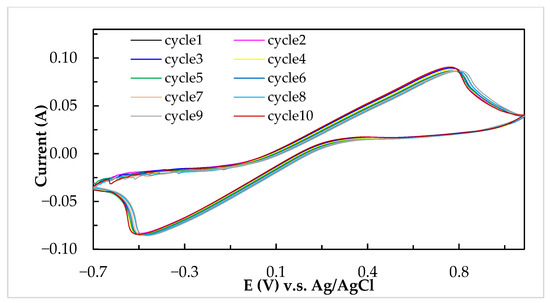Cyclic voltammograms of I2/ascorbic acid/H2SO4 active electrolyte at a concentration ratio of 1.0/0.18/2.0 M for 10 cycles at a scanning rate of 10 mV/s.