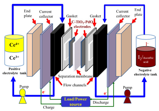 The charge/discharge tests were carried out using 1.0 M Ce(NO3)3·6H2O/2.0 M CH3SO3H as the positive electrolyte, 1.0 M I2/ascorbic acid/2.0 M H2SO4 as the negative electrolyte, C–TiO2–PdO as both positive and negative electrodes, and Nafion 117–SiO2–SO3H as the separation membrane at a current density of 20 mA/cm2 and using 20 mL of electrolyte solutions. A charge/discharge test was conducted using a WBCS3000 battery cycler system (Top Trans, Korea) and CT2001C 10 V/2A (Wuhan Land Co., Wuhan, China) apparatus.