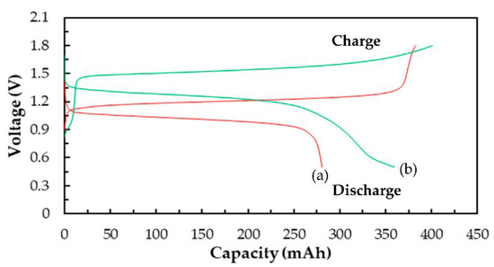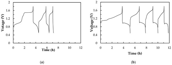 Figure 8 shows the charge/discharge cycle diagrams of the Ce/ascorbic acid/I RFB system in the third lap with N-117 and the modified N-117–SiO2–SO3H as a separation membrane. The C–TiO2–PdO composite electrodes were used as the positive and negative electrodes. The electrochemical activity of the C–TiO2–PdO composite electrodes was better than that of the carbon paper (C electrode) and showed a good cell performance; the VE% increased from 65% to 79%, and the EE% was raised from 44% to 58%, as shown in Figure 8a and Table 4. In order to improve the ion cross-contamination, using the modified N-117–SiO2–SO3H membranes to replace the commercial N-117 can effectively enhance the cell efficiency, as shown in Figure 8b. Particularly, the CE% of the modified N-117–SiO2–SO3H membrane was raised from 73% to 90%, and the EE% increased from 44% to 72%, as listed in Table 4. In addition, from the charge and discharge capacity curve of Figure 9, it can clearly be seen that the standard potential () and capacity exhibited an improved tendency after replacing the N-117 separation membrane, and the data are summarized in Table 4. The and the capacity of the single Ce/ascorbic acid/I cell were 1.20 V/280 mAh (N-117) and 1.46 V/360 mAh (N-117–SiO2–SO3H), respectively. The results mean that the modified N-117–SiO2–SO3H membrane can effectively inhibit the ion cross-contamination, thus, the standard potential of this Ce/ascorbic acid/I RFB system significantly increased from 1.20 to 1.46 V and the discharge capacity from 280 to 360 mAh. A plausible explanation for these results is that the modified membrane with low permeability/water uptake and high ion exchange capacity (IEC) value not only inhibits the cross-over pollution of the active species ions and avoids the non-equivalent concentration effect of the Nernst equation but also increases the conductivity of H+ protons [30]. Thus, the modified membrane can help to effectively enhance the standard potential and discharge capacity of this Ce/ascorbic acid/I RFB system.