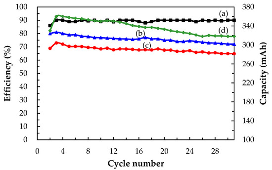 Figure 10 shows charge–discharge performance over 30 cycles (2nd to 31st) in terms of (a) CE, (b) VE, (c) EE, and (d) discharge capacity of a single Ce/ascorbic acid/I RFB system. The results showed that the VE and discharge capacity values were decreased with the increase of the charge/discharge cycle number because of factors such as internal ohmic resistance, overcharge, and concentration polarization. The average CE, VE, and EE of this Ce/ascorbic acid/I RFB system were 89.51%, 75.88%, and 68.04% after 30 cycles, and the average discharge capacity, was 337.67 mAh. The attenuated percentage was less than 6% for the EE value and discharge capacity.