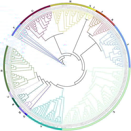 A total of 155 putative BpUGTs were identified in the paper mulberry genome using the HMM and BLASTP programs. The length of the deduced UGT proteins varied from 238 to 874 amino acids, with an average of 475. The predicted molecular weight ranged from 26 to 97 kDa. The isoelectric point ranged from 5.03 to 8.7 (Supplementary Materials Table S1). The phylogenetic analysis of the identified UGTs was performed to analysis their grouping pattern and their genetic relationships based on the Arabidopsis UGT sequences. The paper mulberry UGTs were classified into 15 subgroups (A-O), including one newly discovered group (group O), which was present in B. papyrifera but not in A. thaliana (Figure 1).